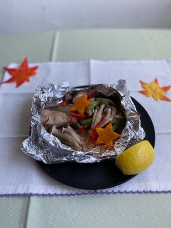アルミホイルを2枚30cmの大きさに切って1枚目に1をのせて上に2の野菜、バターをのせてさらにもう一枚のアルミホイルを上からかぶせて端をとじて包む。